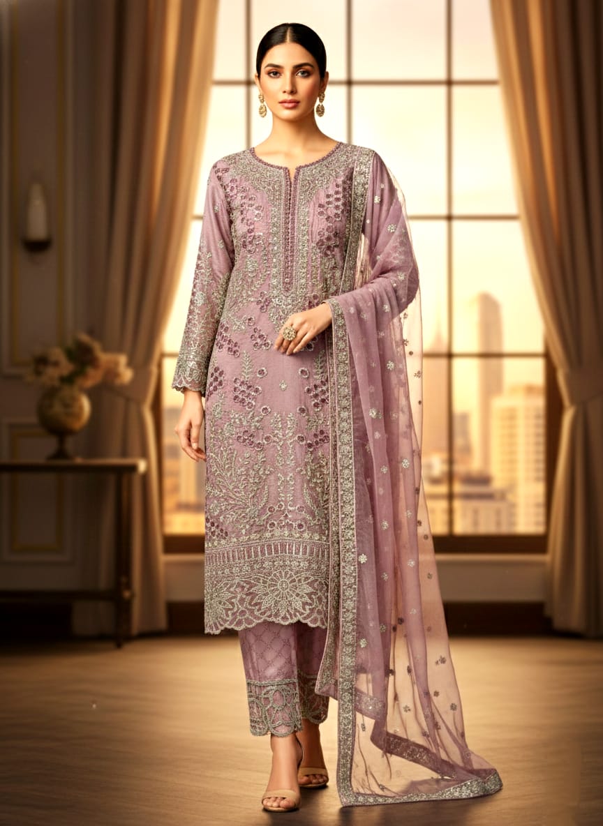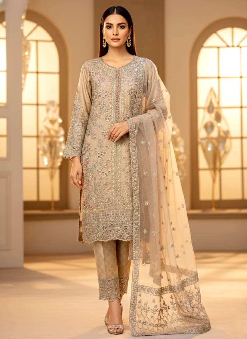 Body & Embroidery: Features a rich display of mukaish-style work, floral vine motifs, and geometric patterns that cover the entire front panel.